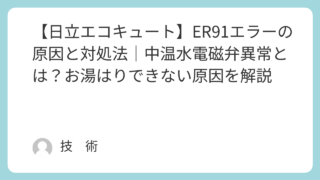 「エコキュートにER91エラーが表示された…」「給湯は使えるのに、お風呂のお湯はりができない…」そんな症状でお困りではありませんか?日立エコキュートのER91エラーは、中温水電磁弁の異常(ON故障)を示すエラーです。お風呂機能に直接影響する...